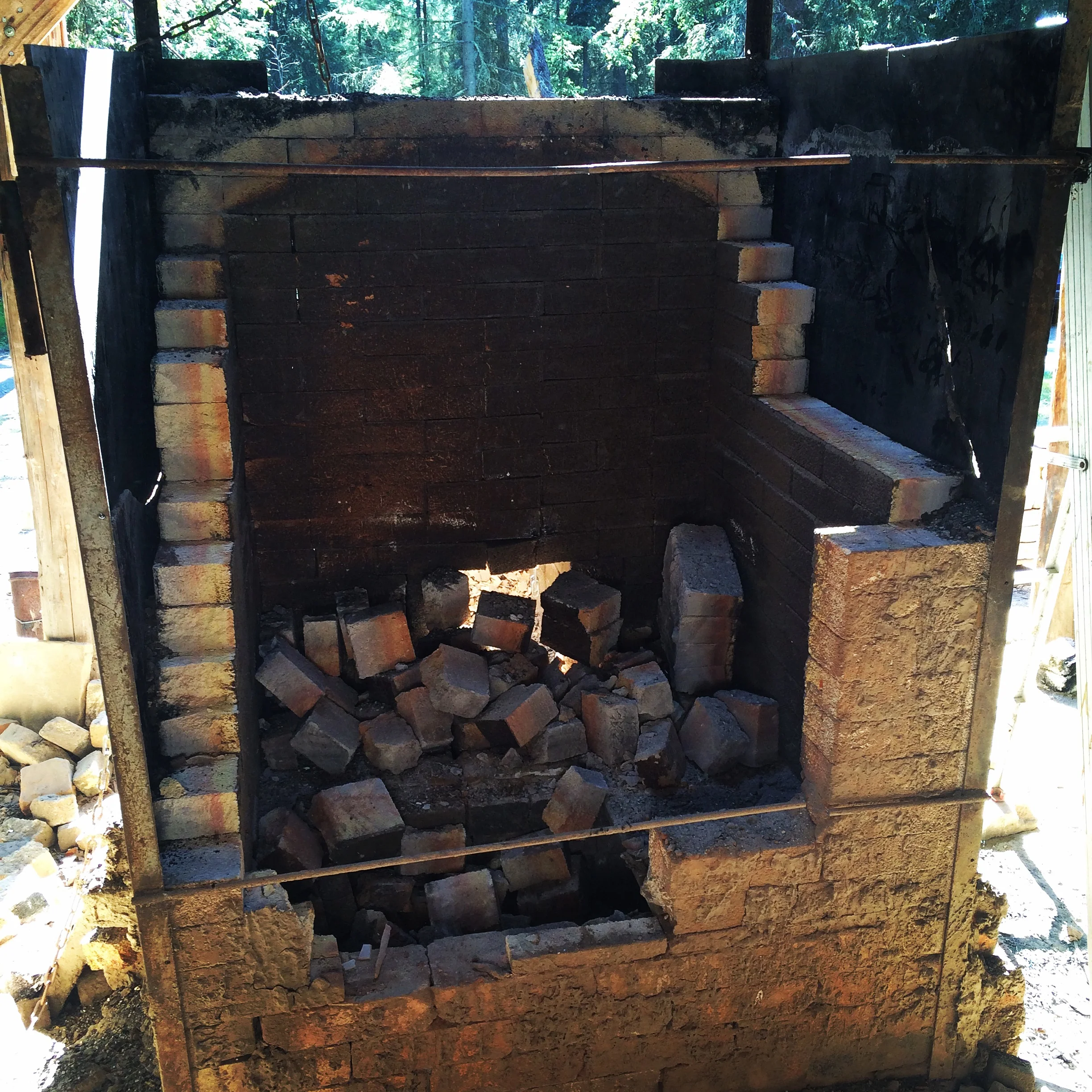 Down she goes! Most of the soft brick just crumbled as it was being taken down. The floor (which were shelves, surprisingly made it though the 103rd firing, but didn't last five minutes when we were taking her down!). Sadly the majority of the soft bricks were designated for the fill dirt pile.