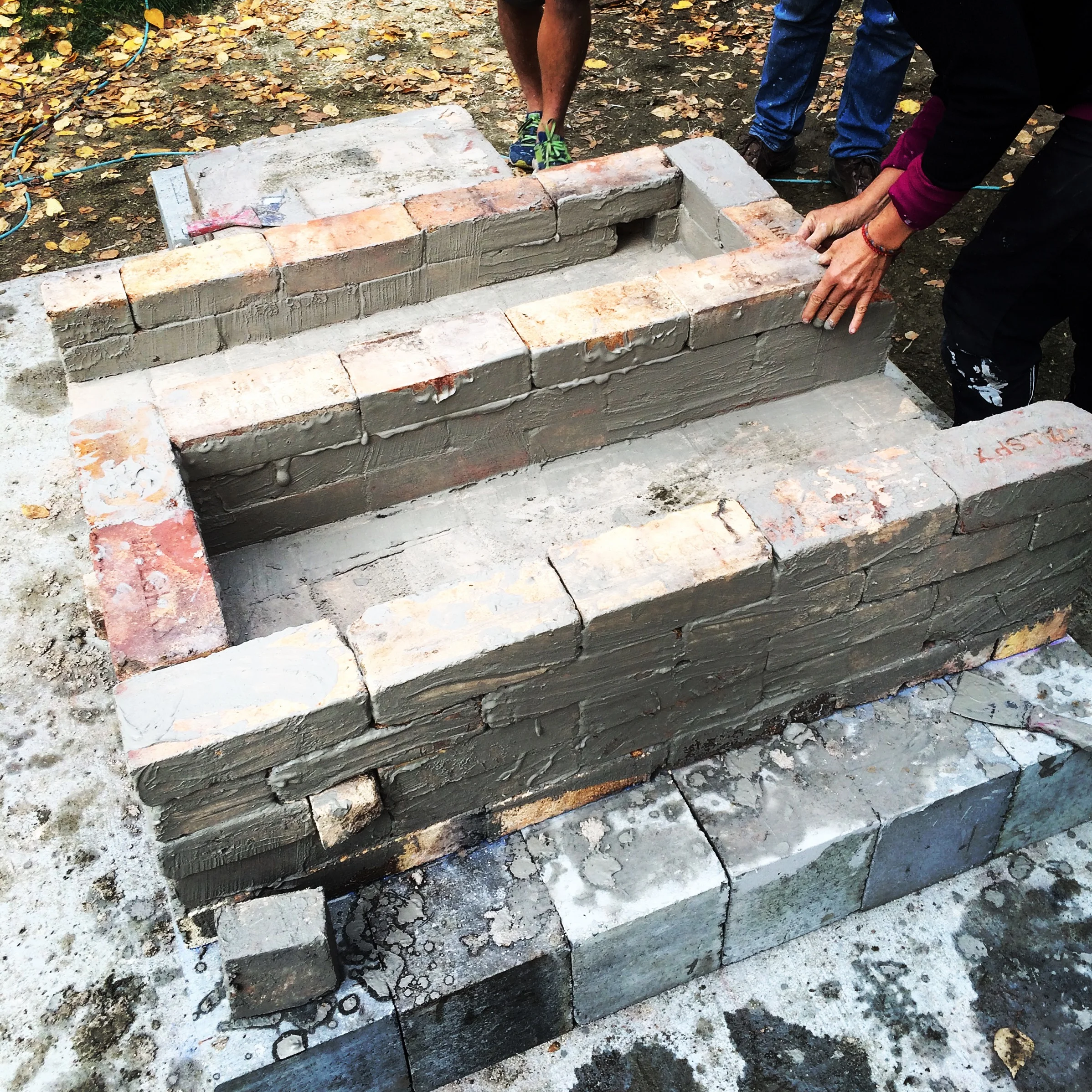 And so the rebuild begins! The kiln's design is based on the original plans (and the wood kiln plans found in Fred Olsen's "The Kiln Book") with a few modifications. Most of the bricks that we're using have been generously donated by local fellow potters--so we have some 3.5" soft brick and some 4" soft brick, hence calculating and thinking on our feet to ensure true structure for the body! True to the model, a concrete foundation was poured, a layer of cinderblock laid out (to elevate the fireboxes so we don't have to crouch down to stoke--save our backs!), a layer of insulating brick between the cinderblock and firebox, the floor of the kiln (which are two kiln shelves and the last thing we put in), the body of the kiln, and the chimney. The firebox and chimney will be built using hard brick, the body out of the soft brick.