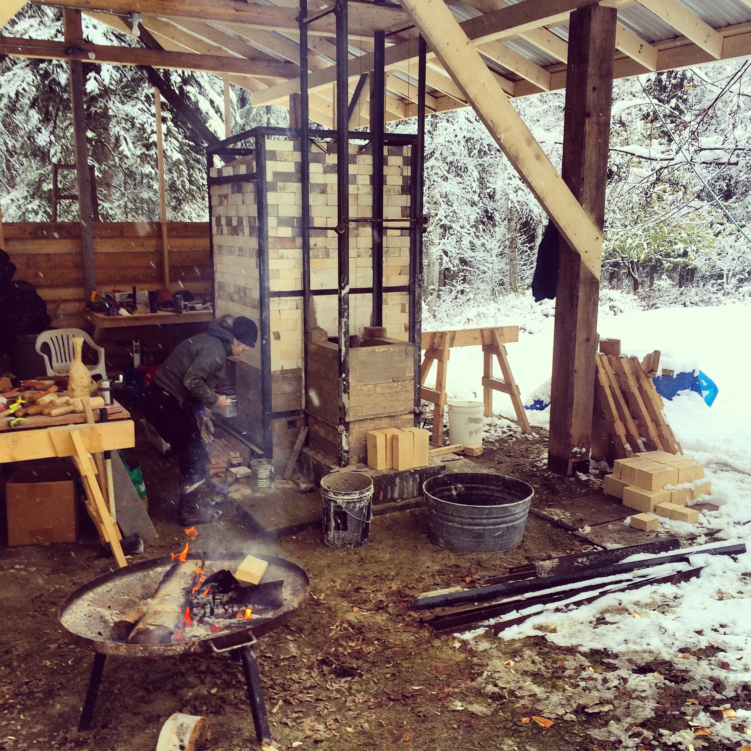 And then it snowed..The next step was to build the chimney. Each hard brick was dipped in fireclay to help seal of the stack.