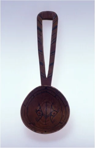 Yup'ik spoon showing a painted design on the interior of the bowl. University of Alaska Museum of the North UA98-016-0001